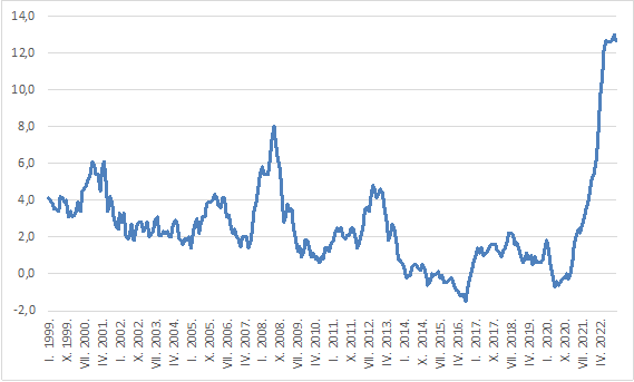 Krenuvši od 1999. godine, možemo vidjeti kako je inflacija bila relativno stabilna skroz do velike financijske krize koja je potekla iz SAD-a. Stopa inflacije je od 2001. godine imala određeni silazni trend prema kojem se s tadašnjih 4,5% spustila do 2% (današnji cilj središnjih banaka). Možemo reći da je inflacija stabilna kada se kreće od nekih 1% do 3%. 2008. godine stopa inflacije skočila je na visokih 8%, što je velikim dijelom posljedica dugotrajne faze gospodarskog rasta. Nakon toga dolazi recesija i kreće određeni silazni trend i „smirivanje“ inflacije te u listopadu 2009. godine imamo stopu inflacije od 0,9%. Primjećujemo da prvi znak deflacije u RH dolazi u 2014. godini. 2015.-te se stopa inflacije kreće oko 0 posto, dok se 2016. deflacija dodatno produbila (-0,9%). Nastavno na „deflacijsku“ 2016.-tu, stope inflacije su bile stabilne i oko jedinice (1%). Deflacija nam se kratkoročno vratila i u travnju 2020. godine kada iznosi -0,1% te traje do listopada 2020. godine kada iznosi -0,2%. Od tada je situacija bila stabilna. Prvi znak upozorenja nam dolazi u rujnu 2021. godine kada nam se javlja stopa inflacije od 4,7%. Osjećalo se u zraku da bi inflacija mogla „buknuti“ te se taj osjećaj zahuktao u ožujku 2022., kada stopa inflacije skače na visoku razinu od 7,3%. Najnoviji podaci pokazuju da je srušen novi rekord. Stopa inflacije u siječnju 2023. iznosi 13,1%, što je najveća stopa inflacije od 1998. godine.