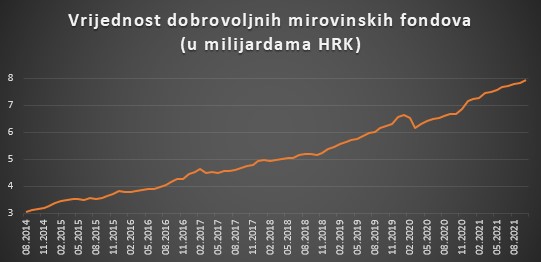 Izvor: izrada autora prema podacima s HANFA-e – Vrijednost imovine dobrovoljnih mirovinskih fondova od kolovoza 2014. do listopada 2021.