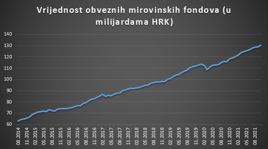 Iz prethodnih grafikona vidimo da je vrijednost imovine obveznih i dobrovoljnih mirovinskih fondova u proteklih 7 godina kontinuirano rasla. Konkretno, vrijednost imovine obveznih mirovinskih fondova je u kolovozu 2014. godine iznosila 63 milijarde kuna, a u listopadu 2021. godine je iznosila 130,5 milijardi kuna, što je rast od 107%. U istom razdoblju vrijednost imovine dobrovoljnih mirovinskih fondova je u kolovozu 2014. godine iznosila 3 milijarde kuna, a u listopadu 2021. godine je iznosila 7,4 milijarde kuna, što je rast od 146%.