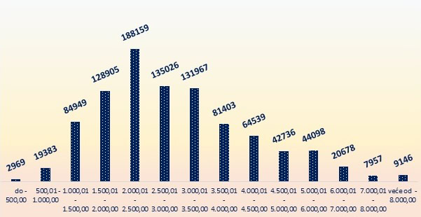U grafikonu ispod je vidljiv broj umirovljenika koji se nalaze u određenom mirovinskom razredu. Iz grafikona je vidljivo da najveći broj umirovljenika ima mirovinu u iznosu od 2.000,01 do 2.500,00 kuna. Podatak koji bode u oči je da Republika Hrvatska ima nešto više od 22 tisuće umirovljenika s mirovinom manjom od tisuću kuna, od čega skoro 3000 osoba ima mirovinu do 500,00 kn, a znamo koliko je teško preživljavati s tolikim iznosom svaki mjesec. No, valja napomenuti da godine radnog staža također igraju ulogu u visini mirovine pa je tako prema podacima HZMO-a prosječan radni staž umirovljenika s mirovinom do 500,00 kn iznosio nešto manje od 15 godina. Naravno, nemoguće je sa sigurnošću tvrditi da apsolutno svi ti umirovljenici žive u teškom siromaštvu jer je moguće i, primjerice, da su neki ljudi koji imaju kratak radni staž i posljedično nisku mirovinu jedan dio svog radnog staža odradili u inozemstvu te radi toga primaju dvije mirovine. Nažalost, detaljniji podaci vezani uz te umirovljenike nisu dostupni.